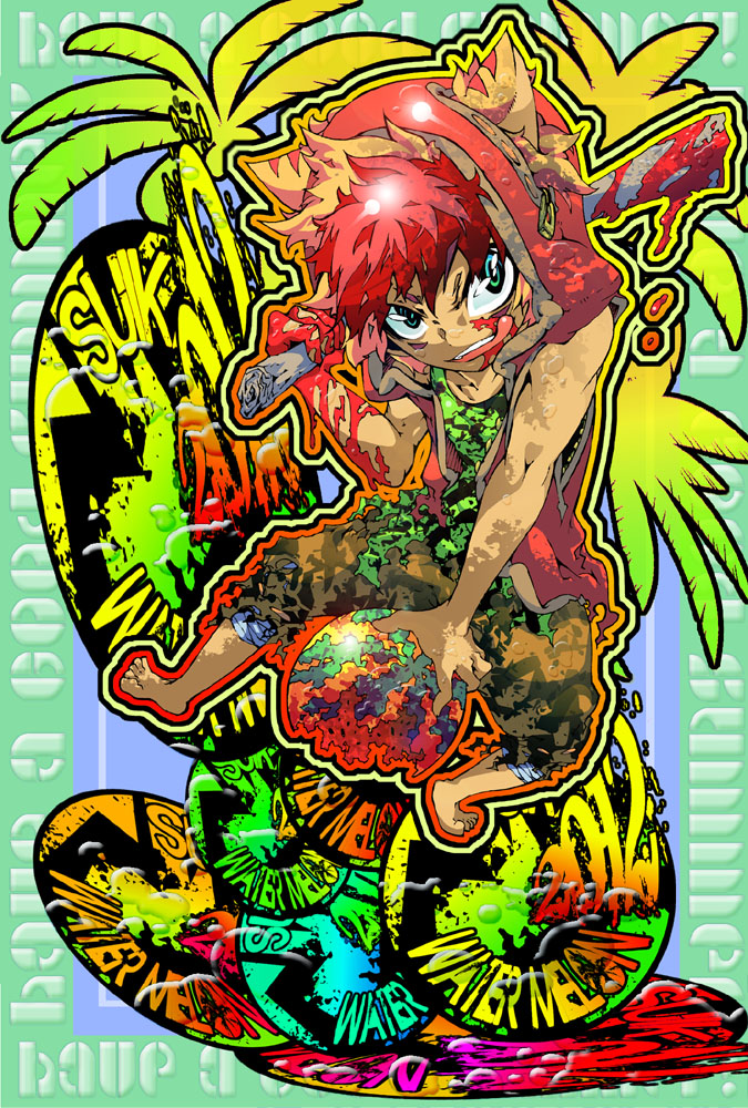 ってわけで残暑お見舞い申し上げます!!! なんとなく南国風味 西瓜の山に座ってる感じに 、、、見えない?まあいいや ・ ・ ・ (ヤシの木はここhttp://kage-design.com/wp/の素材を使わせて貰いました) ・ ・ ・ あ!棍棒の赤いのは血じゃねーですよ、そんな物騒なモン描くわけねーですよ ちょっとスイカ叩き割って中身ぶちまけただけっすよ! ただの夏の風物詩SUIKA割りっすよホント! ・ ・ ・ まあそんな事は置いといて、 ・ 今回はネットで見た水滴の描き方を試してみて軽く感動した! 初めてバケツツールで色塗ったときレベルにドギュンと来た!! やべぇ超楽しい!凄ぇわこれ!! (調子に乗って水浸しにし過ぎた後、大分消して今のに落ち着いた) ・ ・ このサイトhttp://www.webdesignlibrary.jp/の フォトショップ講座 > 画像加工&合成&修正>本物の水滴のつくり方ってやつっす ・ ・ ・ ・ あ〜ーこれで血ぃとか描いたらヤバそうだわーー! 次は血どろみどろな奴描こう!!そのうち、、、絶対!!! ・ ・ ・ ・ ってなわけで 残暑お見舞申し上げました!ではまた~ |